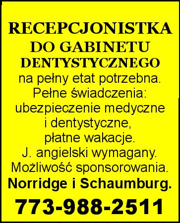 na pełny etat potrzebna. Pełne świadczenia: ubezpieczenie medyczne i dentystyczne, płatne wakacje. J. angielski wymagany. Możliwość sponsorowania. Norridge. 773-988-2511