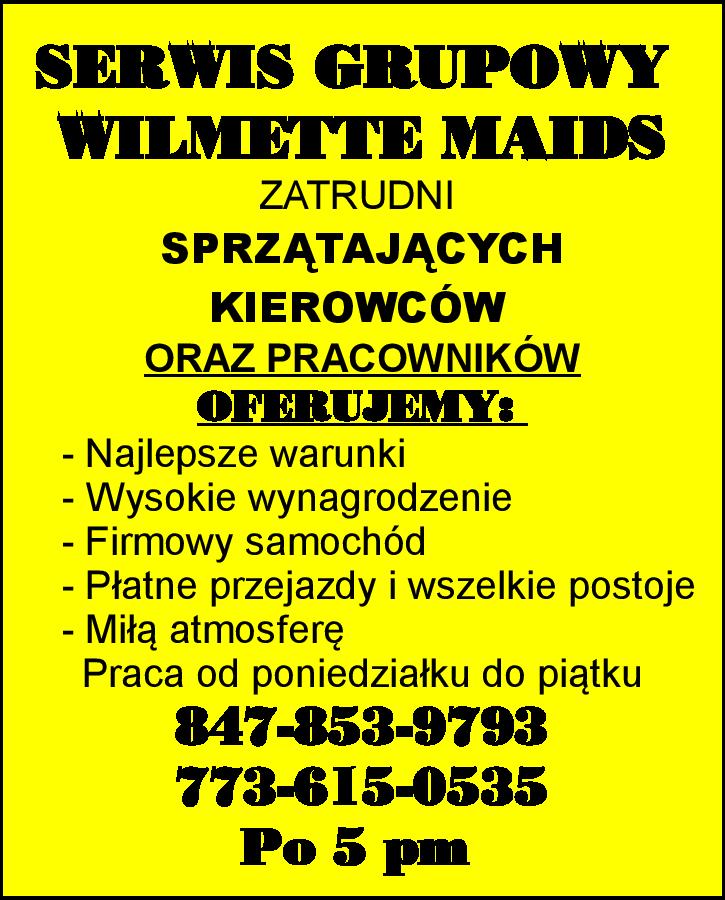 zatrudnię. Praca cały rok. Chicago i przedmieścia. 847-533-0062