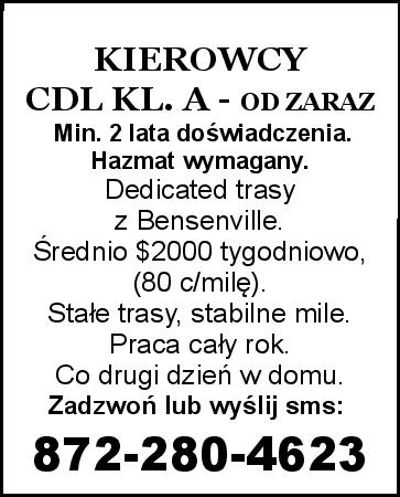 Minimum 2 lata doświadczenia. Hazmat wymagany, Dedicated trasy z Bensenville Średnio $2000/tyg, (80 c/milę) Stałe trasy, stabilne mile. Praca cały rok. Co drugi dzień w domu. Zadzwoń lub wyślij sms: 872-280-4623