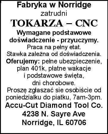 Fabryka w Norridge zatrudni TOKARZA – CNC Wymagane podstawowe doświadczenie - przyuczymy. Praca na pełny etat. Stawka zależna od doświadczenia Oferujemy: pełne ubezpieczenie, plan 401k, płatne wakacje i podstawowe święta, dni chorobowe. Proszę zgłaszać sie osobiście od poniedzialku do Pi […]