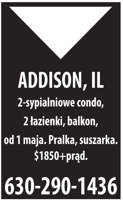 2-sypialniowe condo, 2 łazienki, balkon, od 1 maja. Pralka, suszarka. $1850+prąd. 630-290-1436