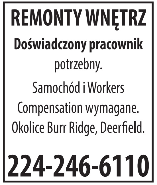 Doświadczony pracownik potrzebny. Samochód i Workers Compensation wymagane. Okolice Burr Ridge, Deerfield. 224-246-6110