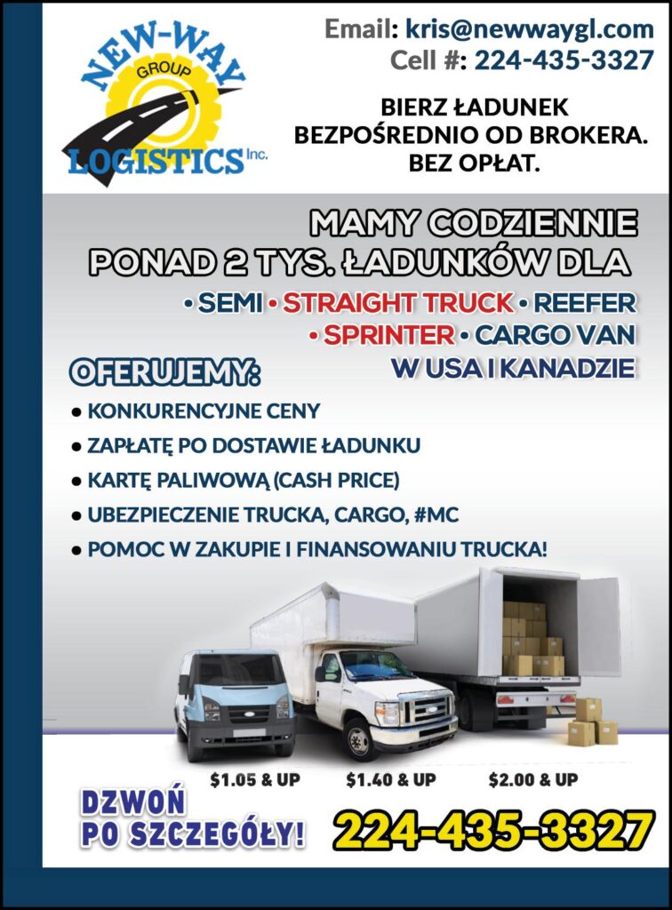 NEW-WAY GROUP LOGISTICS Email: [email protected] Cell # 224-435-3327 BIERZ ŁADUNEK BEZPOŚREDNIO OD BROKERA. BEZ OPŁAT. MAMY CODZIENNIE PONAD 2 TYS. ŁADUNKÓW DLA SEMI. STRAIGHT TRUCK. REEFER. CARGO VAN W USA I KANADZIE. OFERUJEMY: - Konkurencyjne ceny - Zapłatę po dostawie ładunku - […]