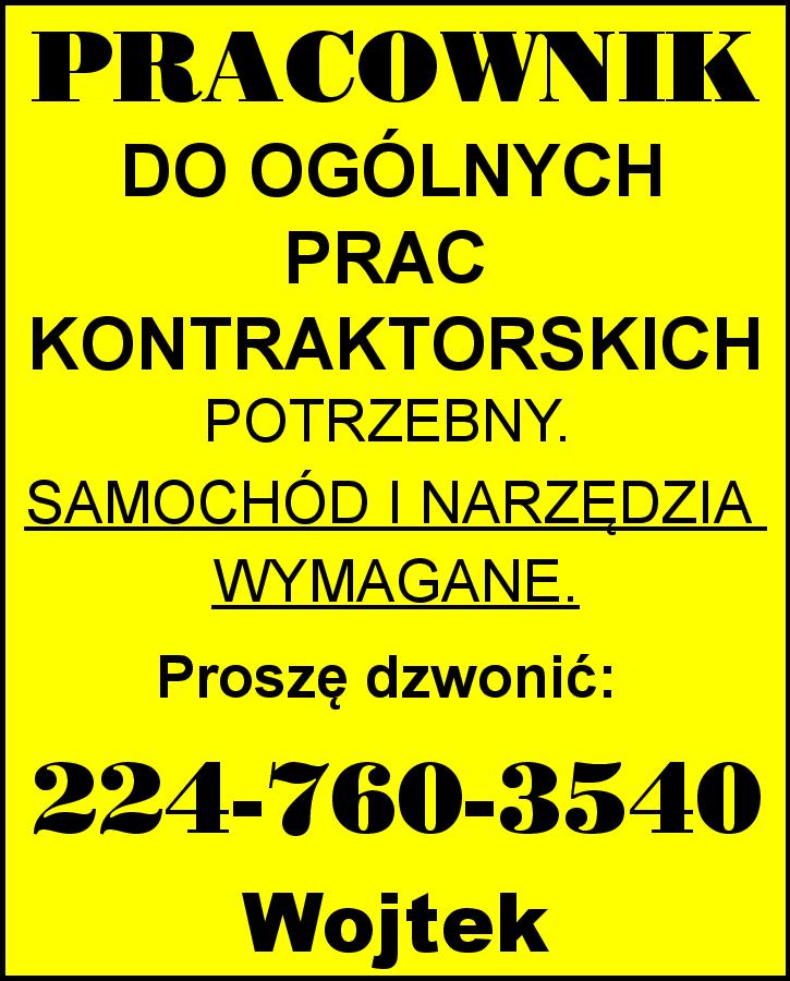 PRACOWNIK DO OGÓLNYCH PRAC KONTRAKTORSKICH POTRZEBNY. SAMOCHÓD I NARZĘDZIA WYMAGANE. Proszę dzwonić: 224-760-3540, Wojtek