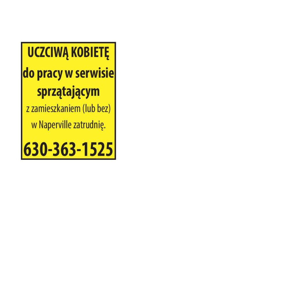 UCZCIWĄ KOBIETĘ do pracy w serwisie sprzątającym z zamieszkaniem (lub bez) w Naperville zatrudnię. 630-363-1525