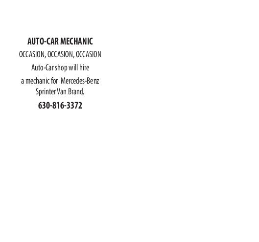 AUTO-CAR MECHANIC OCCASION, OCCASION, OCCASION Auto-Car shop will hire a mechanic for Mercedes-Benz Sprinter Van Brand. 630-816-3372 773-259-1239