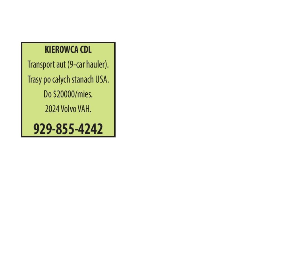 Firma transportowa zatrudni WŁAŚCICIELI CIĘŻARÓWEK Z PRZYCZEPAMI. Trasy OTR. TEAM KIEROWCÓW CDL KL. A Trasy na Midwest. $0.75/milę & do AZ, CA, WA, FL, TX - $0.70/milę. Karty paliwowe. Dobre warunki pracy. Regularne wypłaty. Baza w Park City. 773-304-6031 224-599-6001
