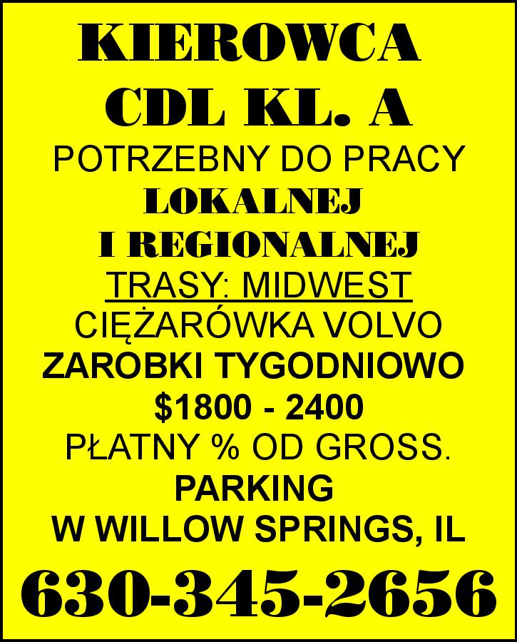 KIEROWCA CDL KL. A POTRZEBNY DO PRACY LOKALNEJ I REGIONALNEJ. TRASY: MIDWEST. CIĘŻARÓWKA VOLVO. ZAROBKI TYGODNIOWO $1800 - 2400. PŁATNY % OD GROSS. PARKING W WILLOW SPRINGS, IL. 630-345-2656