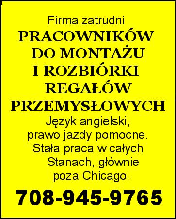 FIRMA ZATRUDNI PRACOWNIKÓW DO MONTAŻU I ROZBIÓRKI REGAŁÓW PRZEMYSŁOWYCH. Język angielski, prawo jazdy pomocne. Stała praca w całych Stanach, głównie poza Chicago. 708-945-9765
