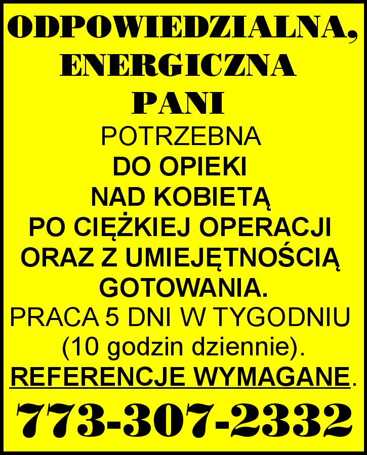 ODPOWIEDZIALNA, ENERGICZNA PANI POTRZEBNA DO OPIEKI NAD KOBIETĄ PO CIĘŻKIEJ OPERACJI ORAZ Z UMIEJĘTNOŚCIĄ GOTOWANIA. PRACA 5 DNI W TYGODNIU (10 godzin dziennie). REFERENCJE WYMAGANE. 773-307-2332