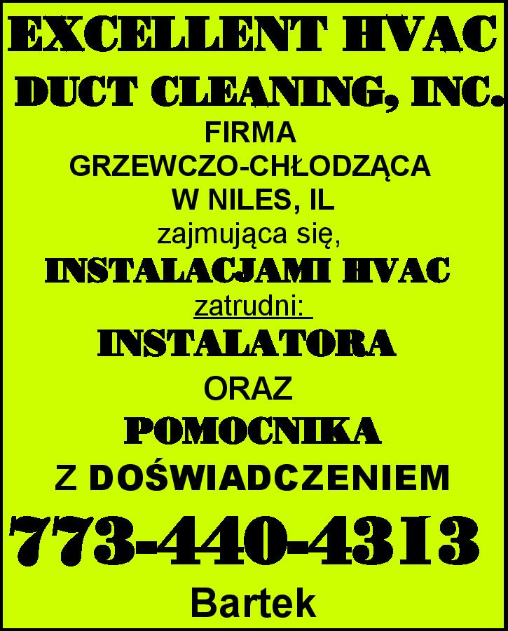 FIRMA GRZEWCZO-CHŁODZĄCA W NILES, IL zajmująca się, INSTALACJAMI HVAC zatrudni: INSTALATORA ORAZ POMOCNIKA Z DOŚWIADCZENIEM 773-440-4313, Bartek