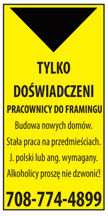 Budowa nowych domów. Stała praca na przedmieściach. J. polski lub ang. wymagany. Alkoholicy proszę nie dzwonić! 708-774-4899
