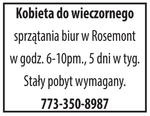 sprzątania biur w Rosemont w godz. 6-10pm., 5 dni w tyg. Stały pobyt wymagany. 773-350-8987