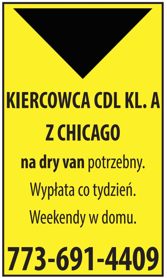 FIRMA W WEST CHICAGO, IL ZATRUDNI KIEROWCĘ CDL KL. A. PRACA LOKALNA. Doświadczenie wymagane. Stała praca. Możliwość pracy bez ELD. 773-691-4107 847-848-1357