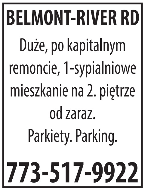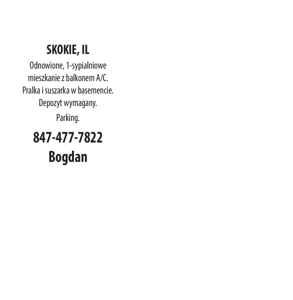 SKOKIE, IL Odnowione, 1-sypialniowe mieszkanie z balkonem A/C. Pralka i suszarka w basemencie. Depozyt wymagany. Parking. 847-477-7822 Bogdan