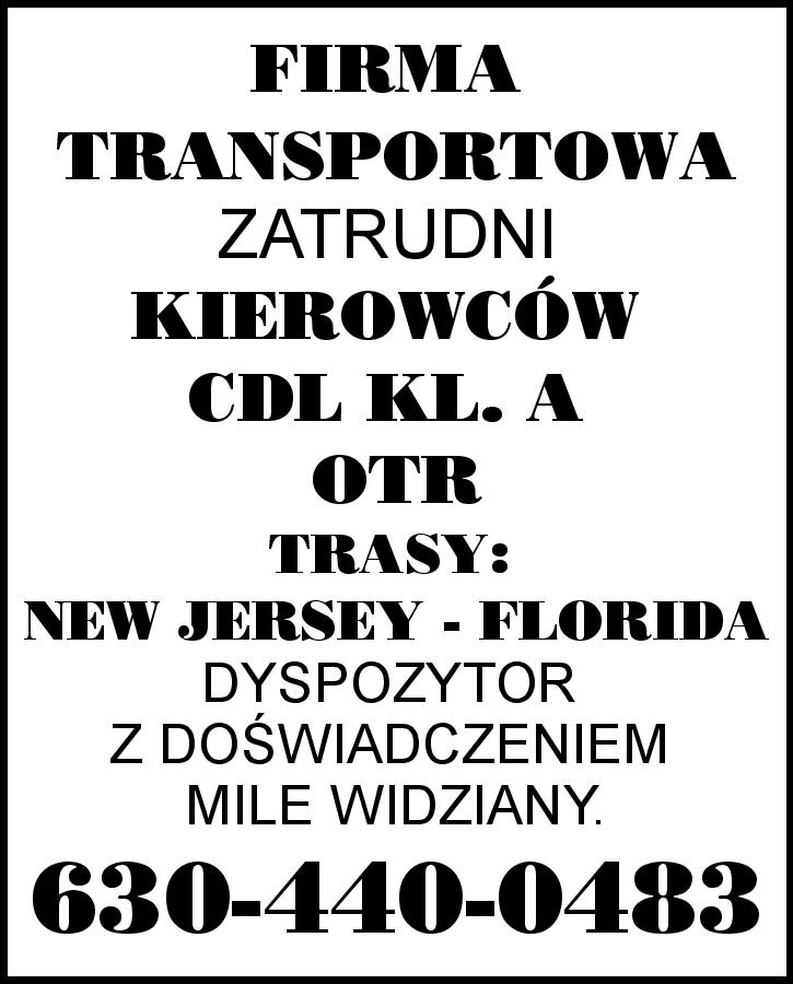 FIRMA TRANSPORTOWA ZATRUDNI KIEROWCÓW CDL KL. A OTR . TRASY: NEW JERSEY - FLORIDA DYSPOZYTOR Z DOŚWIADCZENIEM MILE WIDZIANY. 630-440-0483