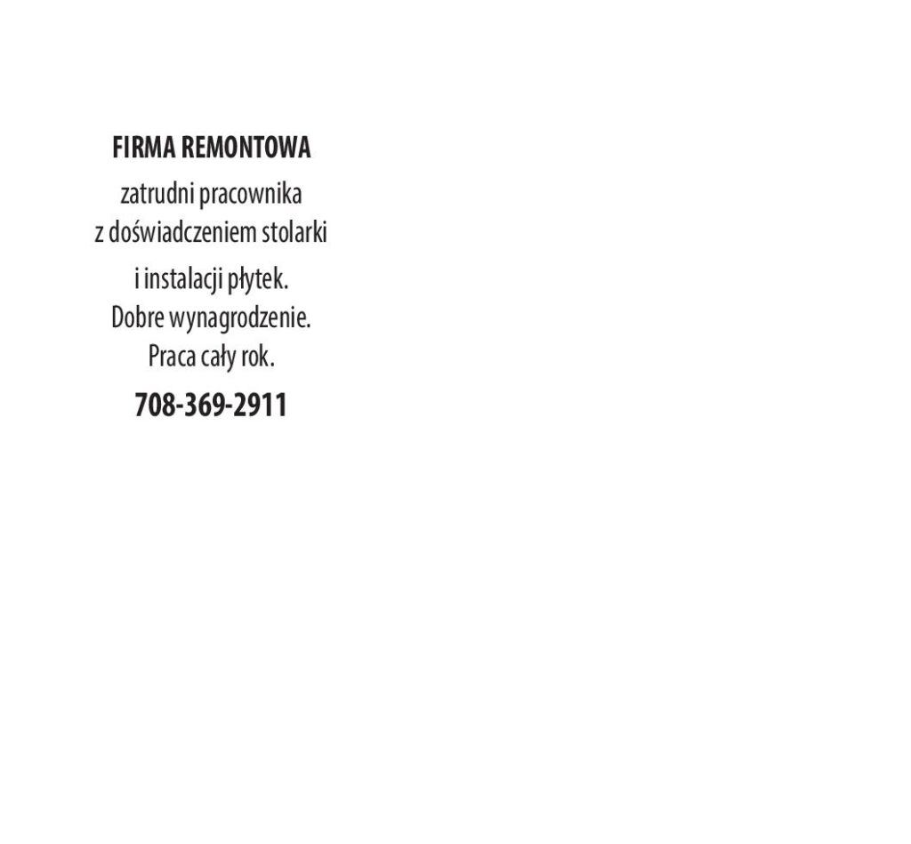 FIRMA REMONTOWA zatrudni pracownika z doświadczeniem stolarki i instalacji płytek. Dobre wynagrodzenie. Praca cały rok. 708-369-2911