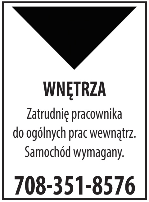 WNĘTRZA Zatrudnię pracownika do ogólnych prac wewnątrz. Samochód wymagany. 708-351-8576