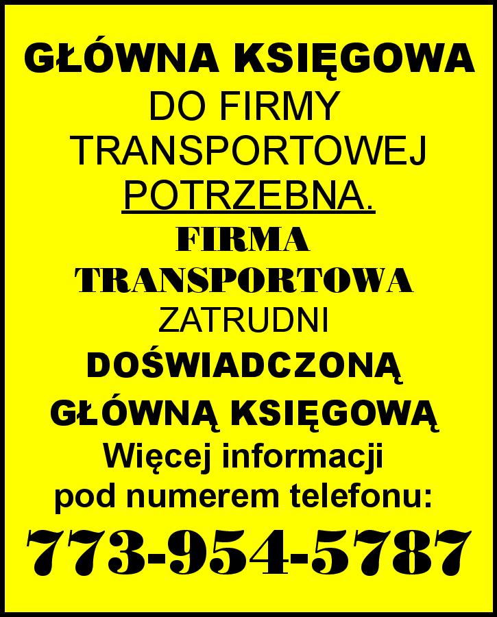 GŁÓWNA KSIĘGOWA DO FIRMY TRANSPORTOWEJ POTRZEBNA. FIRMA TRANSPORTOWA ZATRUDNI DOŚWIADCZONĄ GŁÓWNĄ KSIĘGOWĄ. Więcej informacji pod numerem telefonu: 773-954-5787