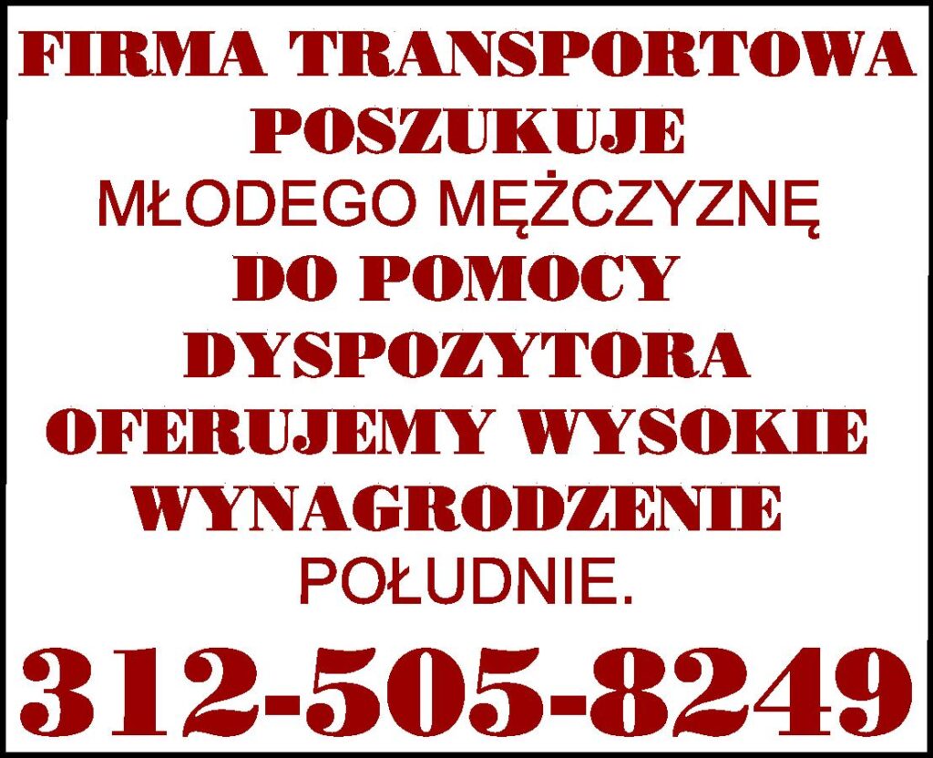DYSPOZYTOR Z DOŚWIADCZENIEM FIRMA TRANSPORTOWA ZLOKALIZOWANA PRZY LOTNISKU O' HARE, ZATRUDNI DYSPOZYTORA Z DOŚWIADCZENIEM. Dzienna zmiana 6 am-6 pm. Praca środa - niedziela. ŁADUNKI LOKALNE. 847-878-3989, Greg