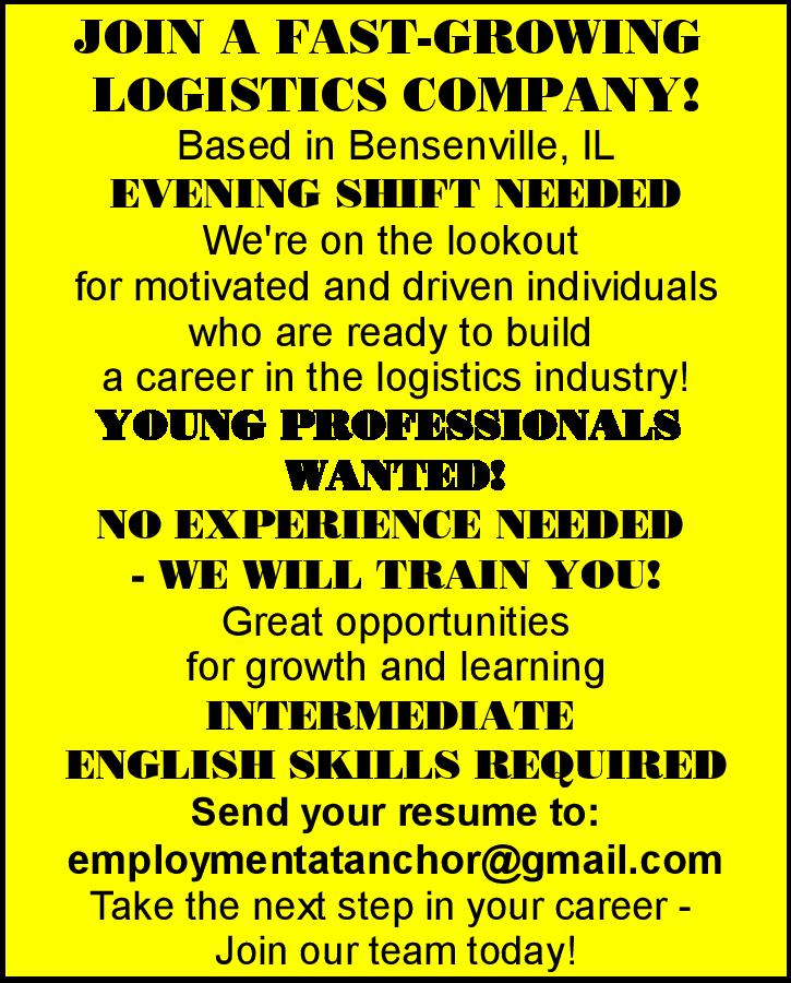 JOIN A FAST-GROWING LOGISTICS COMPANY! Based in Bensenville, IL EVENING SHIFT NEEDED. We're on the lookout for motivated and driven individuals who are ready to build a career in the logistics industry! YOUNG PROFESSIONALS WANTED! NO EXPERIENCE NEEDED - WE WILL TRAIN YOU! Great opportunit […]