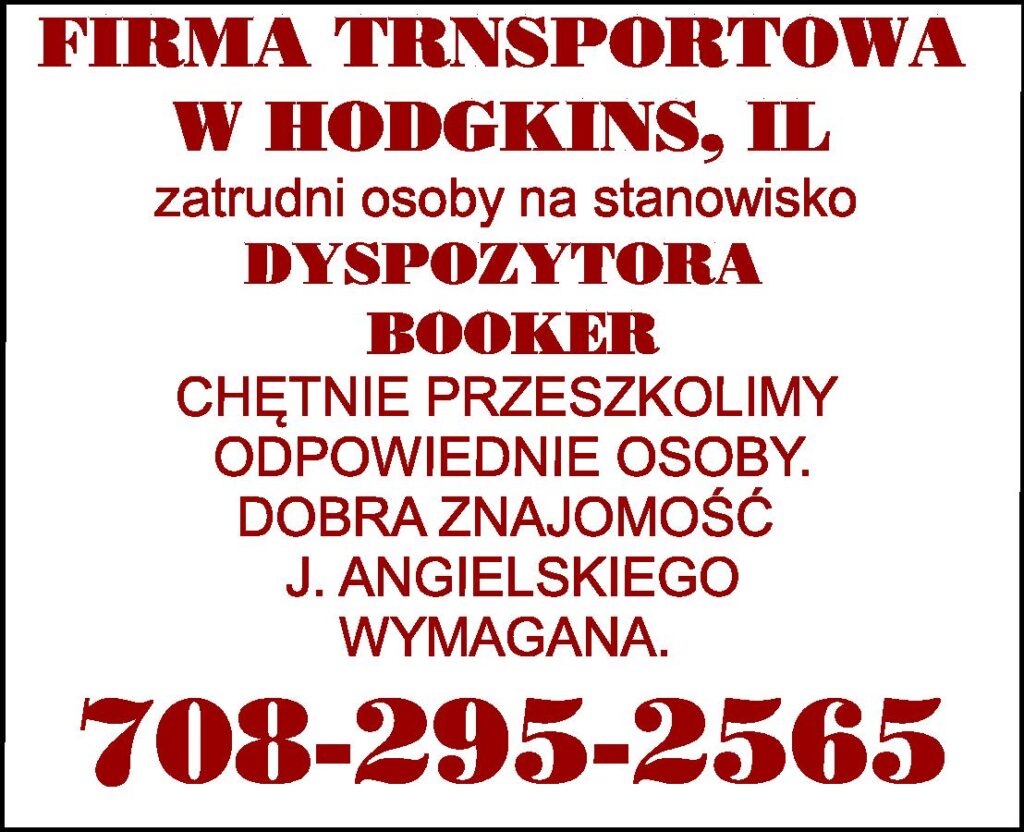 FIRMA TRNSPORTOWA W HODGKINS, IL zatrudni osoby na stanowisko DYSPOZYTORA. BOOKER CHĘTNIE PRZESZKOLIMY ODPOWIEDNIE OSOBY. DOBRA ZNAJOMOŚĆ J. ANGIELSKIEGO WYMAGANA. 708-295-2565