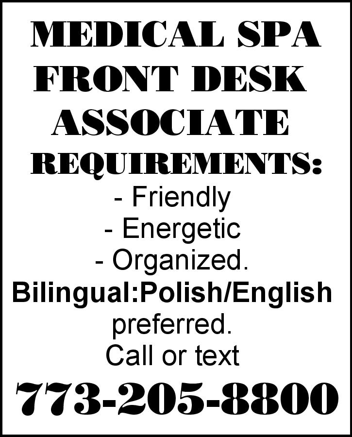 MEDICAL SPA FRONT DESK ASSOCIATE REQUIREMENTS: - Friendly - Energetic - Organized. Bilingual Polish/English preferred. Call or text 773-205-8800