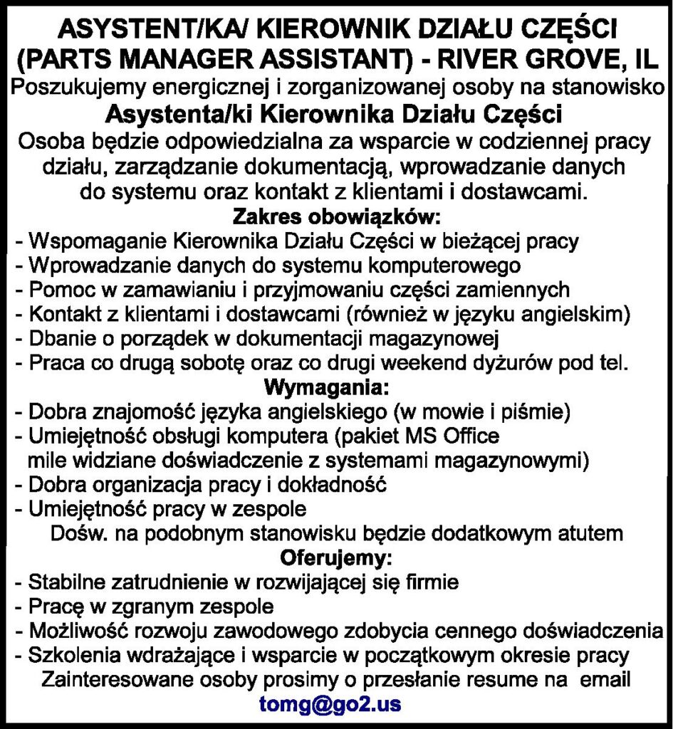 ASYSTENT/KA/KIEROWNIK DZIAŁU CZĘŚCI (PARTS MANAGER ASSISTANT) RIVER GROVE, IL Poszukujemy energicznej i zorganizowanej osoby na stanowisko Asystenta/ki Kierownika Działu Części. Osoba zatrudniona na tym stanowisku będzie odpowiedzialna za wsparcie w codziennej pracy działu, zarządzanie d […]