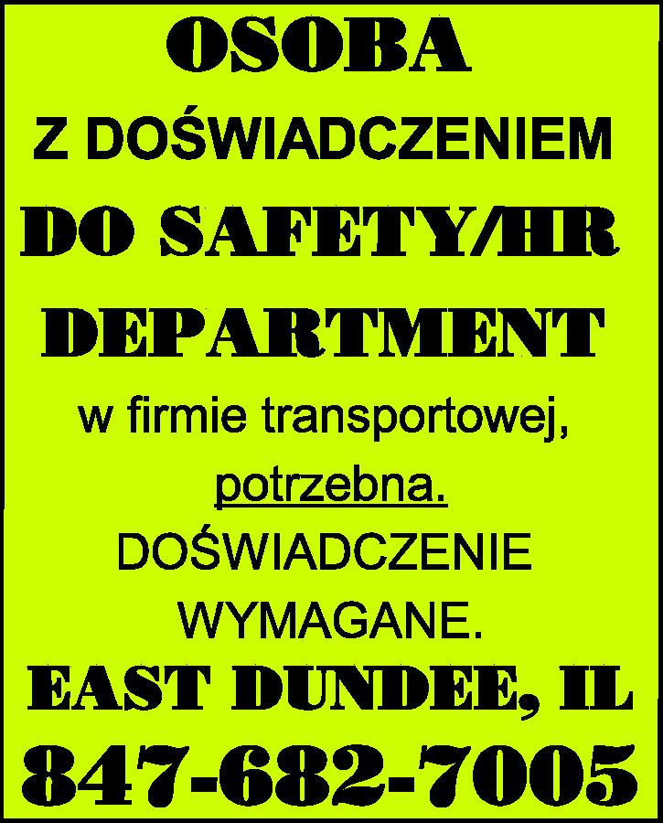 OSOBA Z DOŚWIADCZENIEM DO SAFETY/HR DEPARTMENT w firmie transportowej, potrzebna. DOŚWIADCZENIE WYMAGANE. EAST DUNDEE, IL 847-682-7005