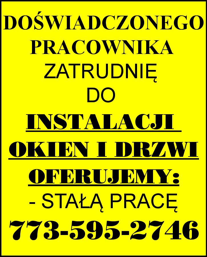 ZATRUDNIĘ DO INSTALACJI OKIEN I DRZWI OFERUJEMY: - STAŁĄ PRACĘ 773-595-2746