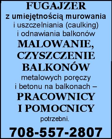 i uszczelniania (caulking) i odnawiania balkonów MALOWANIE, CZYSZCZENIE BALKONÓW, metalowych poręczy i betonu na balkonach - PRACOWNICY I POMOCNICY potrzebni. 708-557-2807