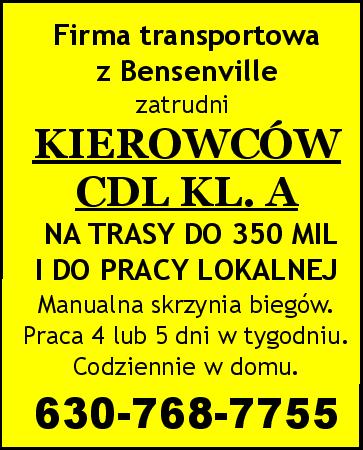 Firma transportowa z Bensenville, IL zatrudni KIEROWCÓW CDL KL. A NA TRASY DO 350 MIL I NA TRASY LOKALNE. Manualna skrzynia biegów Praca 4 lub 5 dni w tygodniu. Codziennie w domu. 630-768-7755