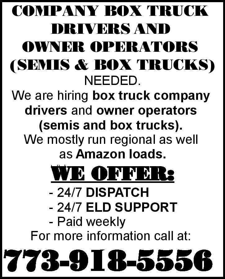 COMPANY BOX TRUCK DRIVERS NEEDED AND OWNER OPERATORS (SEMIS AND BOX TRUCKS) We are hiring box truck company drivers and owner operators (semis and box trucks). We mostly run regional as well as Amazon loads. WE OFFER: - 24/7 DISPATCH - 24/7 ELD SUPPORT - Paid weekly For more information […]