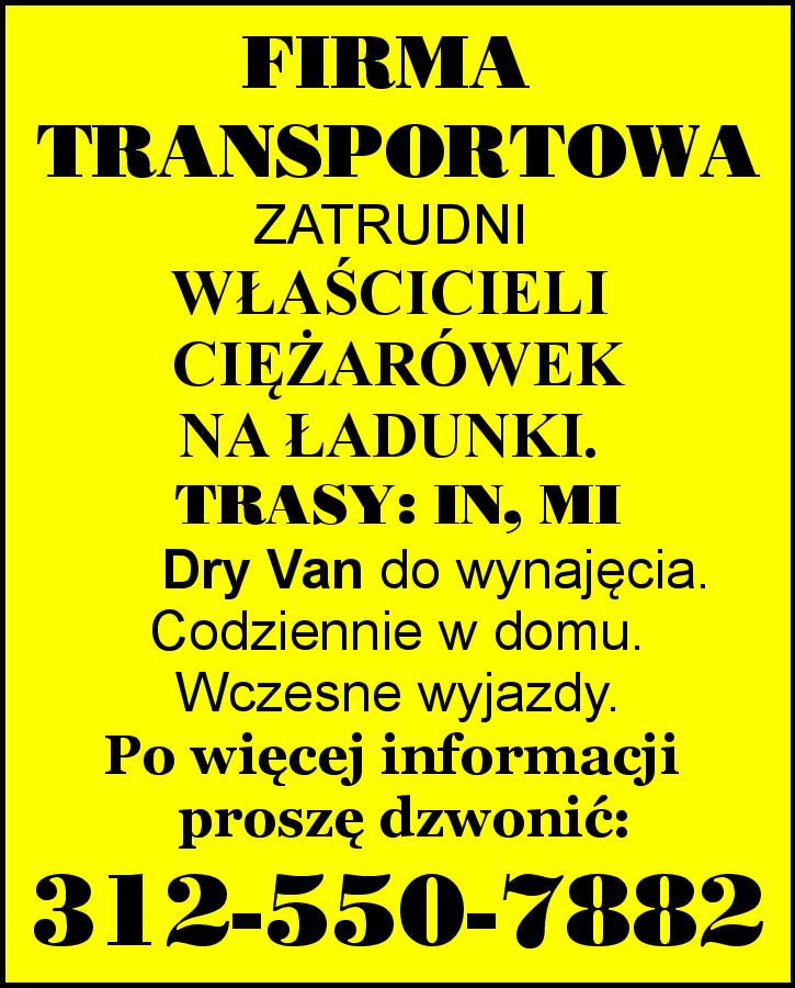 FIRMA TRANSPORTOWA ZATRUDNI WŁAŚCICIELI CIĘŻARÓWEK NA ŁADUNKI. TRASY: IN, MI. Dry Van do wynajęcia. Codziennie w domu. Wczesne wyjazdy. Po więcej informacji proszę dzwonić: 312-550-7882