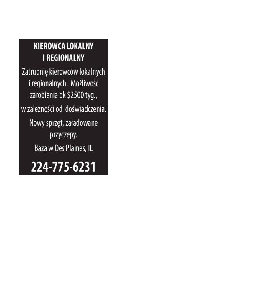KIEROWCA LOKALNY I REGIONALNY Zatrudnię kierowców lokalnych i regionalnych. Możliwość zarobienia ok $2500 tyg., w zależności od doświadczenia. Nowy sprzęt, załadowane przyczepy. Baza w Des Plaines, IL 224-775-6231