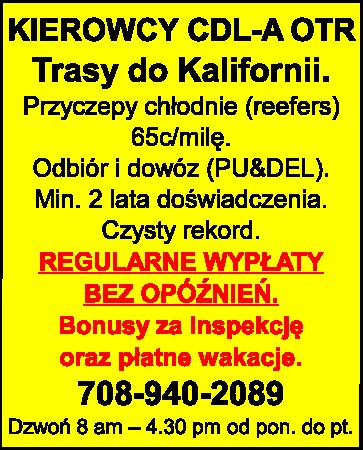 KIEROWCY CDL-A OTR. Trasy do Kalifornii. Przyczepy chłodnie (reefers) - 65c/milę. Odbiór i dowóz (PU&DEL). Min. 2 lata doświadczenia. Czysty rekord. REGULARNE WYPŁATY BEZ OPÓŹNIEŃ. Bonusy za inspekcję oraz płatne wakacje. 708-940-2089 Dzwoń 8 am – 4.30 pm od pon. do pt.