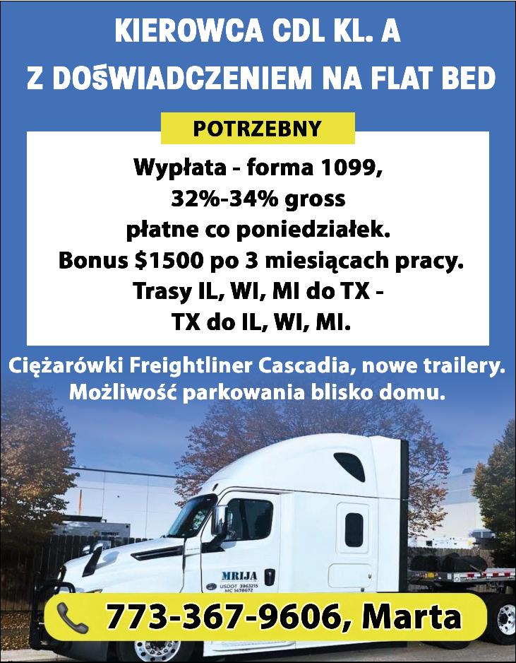 potrzebny. Wypłata - forma 1099, 32%-34% gross płatne co poniedziałek. Bonus $1500 po 3 miesiącach pracy. Trasy IL, WI, MI do TX - TX do IL, WI, MI. Ciężarówki Freightliner Cascadia, nowe trailery. Możliwość parkowania blisko domu. 773-367-9606, Marta