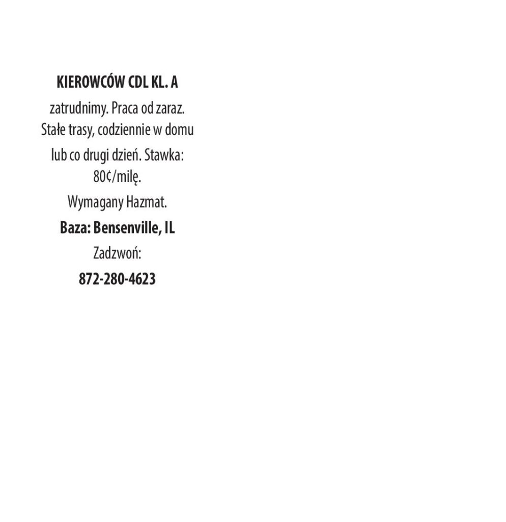 KIEROWCÓW CDL KL. A zatrudnimy. Praca od zaraz. Stałe trasy, codziennie w domu lub co drugi dzień. Stawka: 80¢/milę. Wymagany Hazmat. Baza: Bensenville, IL Zadzwoń: 872-280-4623