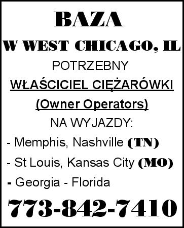 BAZA W WEST CHICAGO, IL POTRZEBNY WŁAŚCICIEL CIĘŻARÓWKI (Owner Operators) NA WYJAZDY: - Memphis, Nashville (TN) - St Louis, Kansas City (MO) - Georgia - Florida 773-842-7410