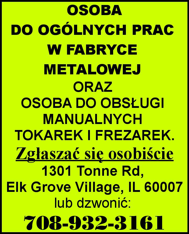OSOBA DO OGÓLNYCH PRAC W FABRYCE METALOWEJ ORAZ OSOBA DO OBSŁUGI MANUALNYCH TOKAREK I FREZAREK. Zgłaszać się osobiście 1301 Tonne Rd, Elk Grove Village, IL 60007 lub dzwonić 708-932-3161