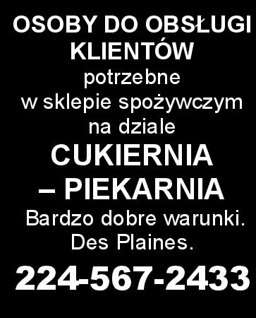 potrzebne w sklepie spożywczym na dziale CUKIERNIA - PIEKARNIA potrzebne. Bardzo dobre warunki pracy. Des Plaines. 224-567-2433