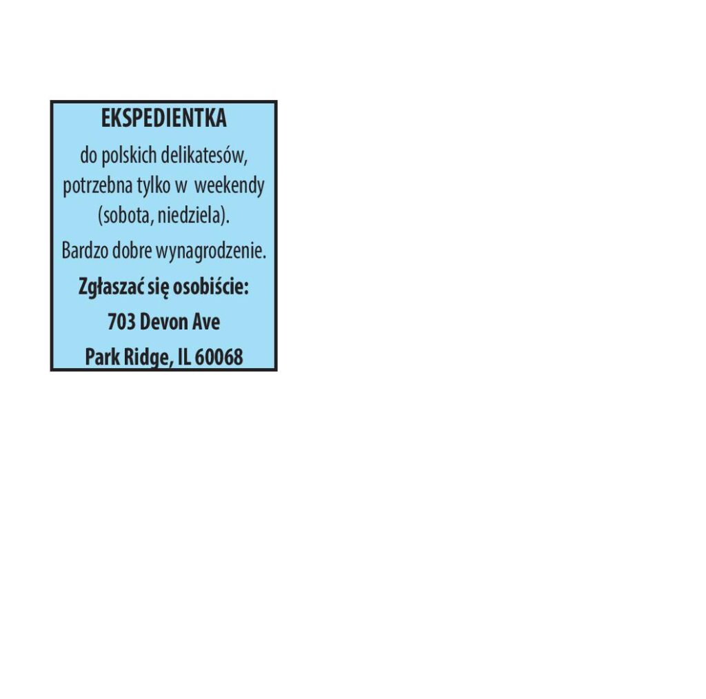 EKSPEDIENTKA do polskich delikatesów, potrzebna tylko w weekendy (sobota, niedziela). Bardzo dobre wynagrodzenie. Zgłaszać się osobiście: 703 Devon Ave Park Ridge, IL 60068