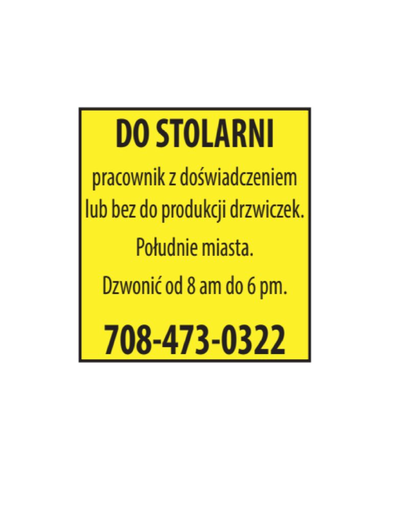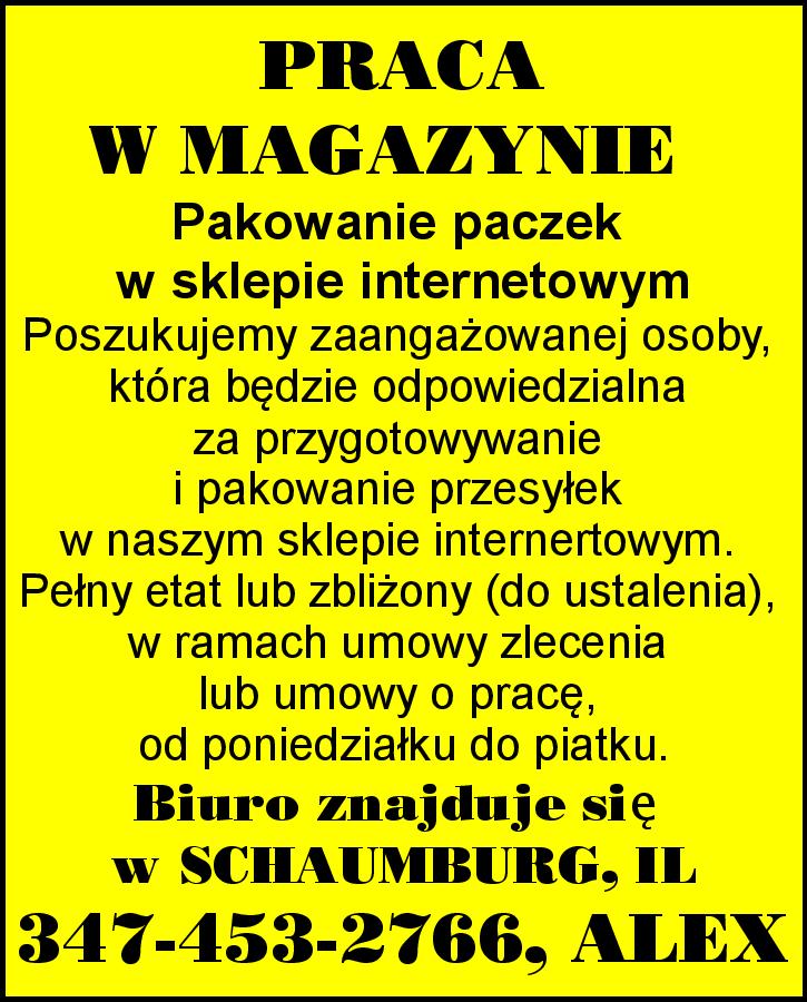 FRANKLIN PARK > KIEROWCĘ KL. C na trasy lokalne w Chicago. Przejazdy/rozładunek. $20/godz. 6am-1pm, 6 dni w tygodniu. > PRACOWNIK na ranną i popołudnioą zmianę. Pełny lub pół etatu. ROLLING MEADOWS > KUCHARZ - OSOBA DO PIECZENIA CIAST. 312-414-9740