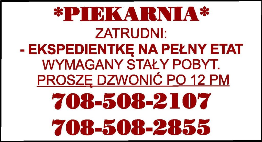 *PIEKARNIA* ZATRUDNI: - EKSPEDIENTKĘ NA PEŁNY ETAT WYMAGANY STAŁY POBYT. PROSZĘ DZWONIĆ PO 12 PM 708-508-2107 708-508-2855