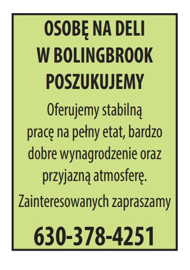 OSOBĘ NA DELI W BOLINGBROOK POSZUKUJEMY Oferujemy stabilną pracę na pełny etat, bardzo dobre wynagrodzenie oraz przyjazną atmosferę. Zainteresowanych zapraszamy 630-378-4251