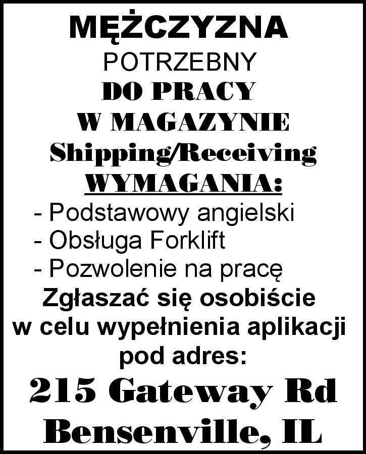 MĘŻCZYZNA POTRZEBNY DO PRACY W MAGAZYNIE. Shipping/Receiving WYMAGANIA: - Podstawowy angielski - Obsługa Forklift - Pozwolenie na pracę Zgłaszać się osobiście w celu wypełnienia aplikacji pod adres: 215 Gateway Rd Bensenville, IL