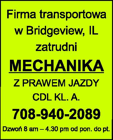 Firma transportowa w Bridgeview, IL zatrudni MECHANIKA Z PRAWEM JAZDY CDL KL. A. 708-940-2089 Dzwoń 8 am – 4.30 pm od pon. do pt.