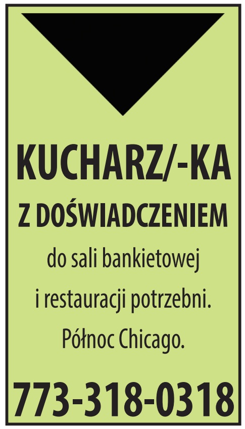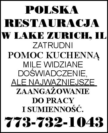 POLSKA RESTAURACJA W LAKE ZURICH, IL ZATRUDNI POMOC KUCHENNĄ. MILE WIDZIANE DOŚWIADCZENIE ALE NAJWAŻNIEJSZE ZAANGAŻOWANIE DO PRACY I SUMIENNOŚĆ. 773-732-1043