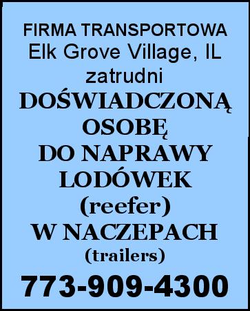 FIRMA TRANSPORTOWA Elk Grove Village, IL zatrudni DOŚWIADCZONĄ OSOBĘ DO NAPRAWY LODÓWEK (reefer) W NACZEPACH (TRAILERS). 773-909-4300