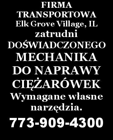 FIRMA TRANSPORTOWA Elk Grove Village, IL zatrudni DOŚWIADCZONEGO MECHANIKA DO NAPRAWY CIĘŻARÓWEK. Wymagane włsne narzędzia. 773-909-4300